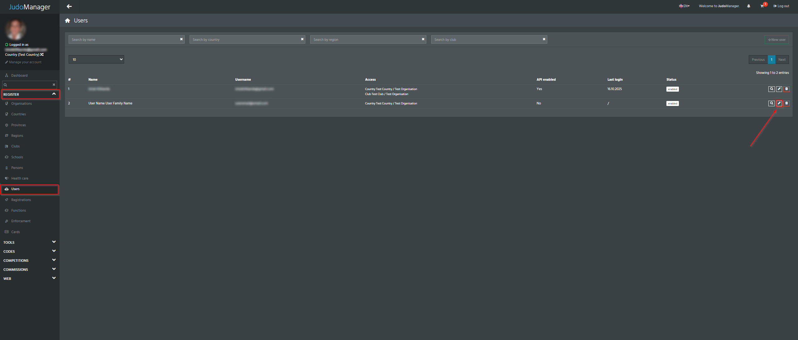 The Users section allows system administrators to manage all user accounts that have access to the admin portal of JudoManager. This includes creating new users, editing existing ones, assigning permissions, managing login status, and enabling API ...